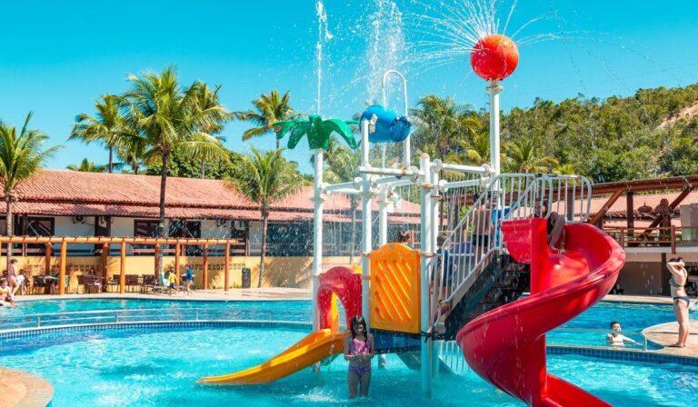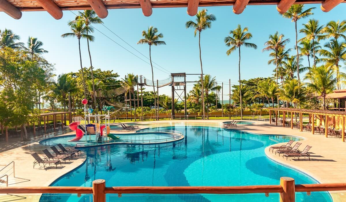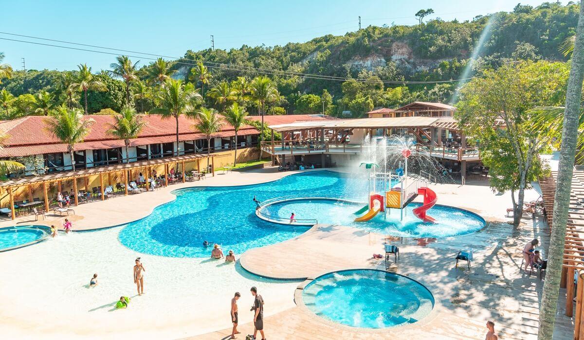 Se você prefere trocar a experiência pé na areia para curtir o dia no Resort, temos várias piscinas inteiramente à sua disposição. Duas delas são para os adultos, sendo uma com prainha. Além disso, no entorno temos duas jacuzzi para dar aquela relaxada. Em uma das piscinas, temos um bar onde é possível tomar uma cervejinha e desfrutar de um delicioso drink. Para a criançada, mais duas piscinas e, em uma delas, temos uma estrutura completa com brinquedos aquáticos.